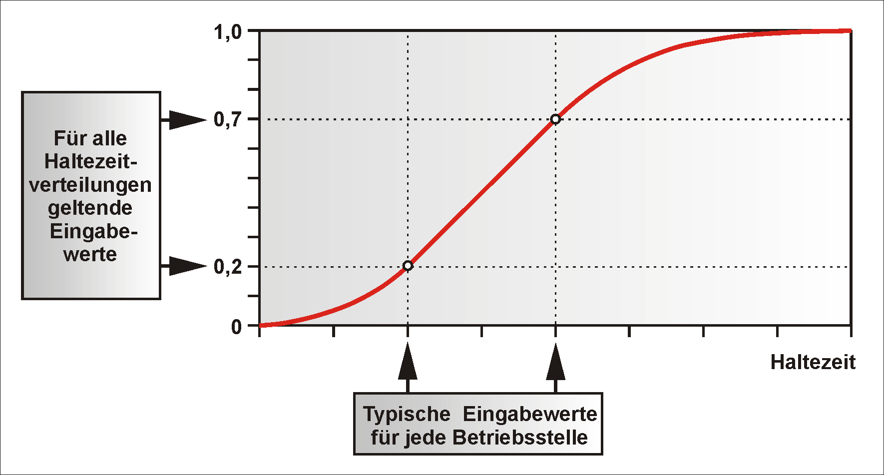 Soll das Programm zur Simulation eingesetzt werden, so müssen weitere Eingaben erfolgen: •Umläufe •Werte der Verteilungsfunktionen In der Umlaufdatei werden die einzelnen Zugnummern über die Wende miteinander verbunden und den Linienbezeichnungen zugeordnet. Die Angabe der Abfahrtszeiten ist erforderlich, um mit den Informationen aus den Infrastrukturdateien und der Liniendatei den Fahrplan zu berechnen. Ein wesentlicher Bestandteil der Simulation sind die Werte der Verteilungsfunktio-nen, die für die Haltezeiten, Fahrzeiten, Wendezeiten und Abfahrtsverspätungen an den Wendebetriebsstellen einzugeben sind. Die Verteilungs- funktionen sind mittels zweier Punkte der Summenlinie, einem Formfaktor und dem Mittelwert zu definieren. Diese Werte können entweder auf- grund von Messungen des realen Betriebsablaufs definiert oder zumindest teilweise anhand von Erfahrungswerten bestimmt werden. Die nebenstehende Grafik zeigt die Summenlinie der Verteilungsfunktion mit den erforderlichen Eingabewerten am Beispiel der Haltezeitverteilung.